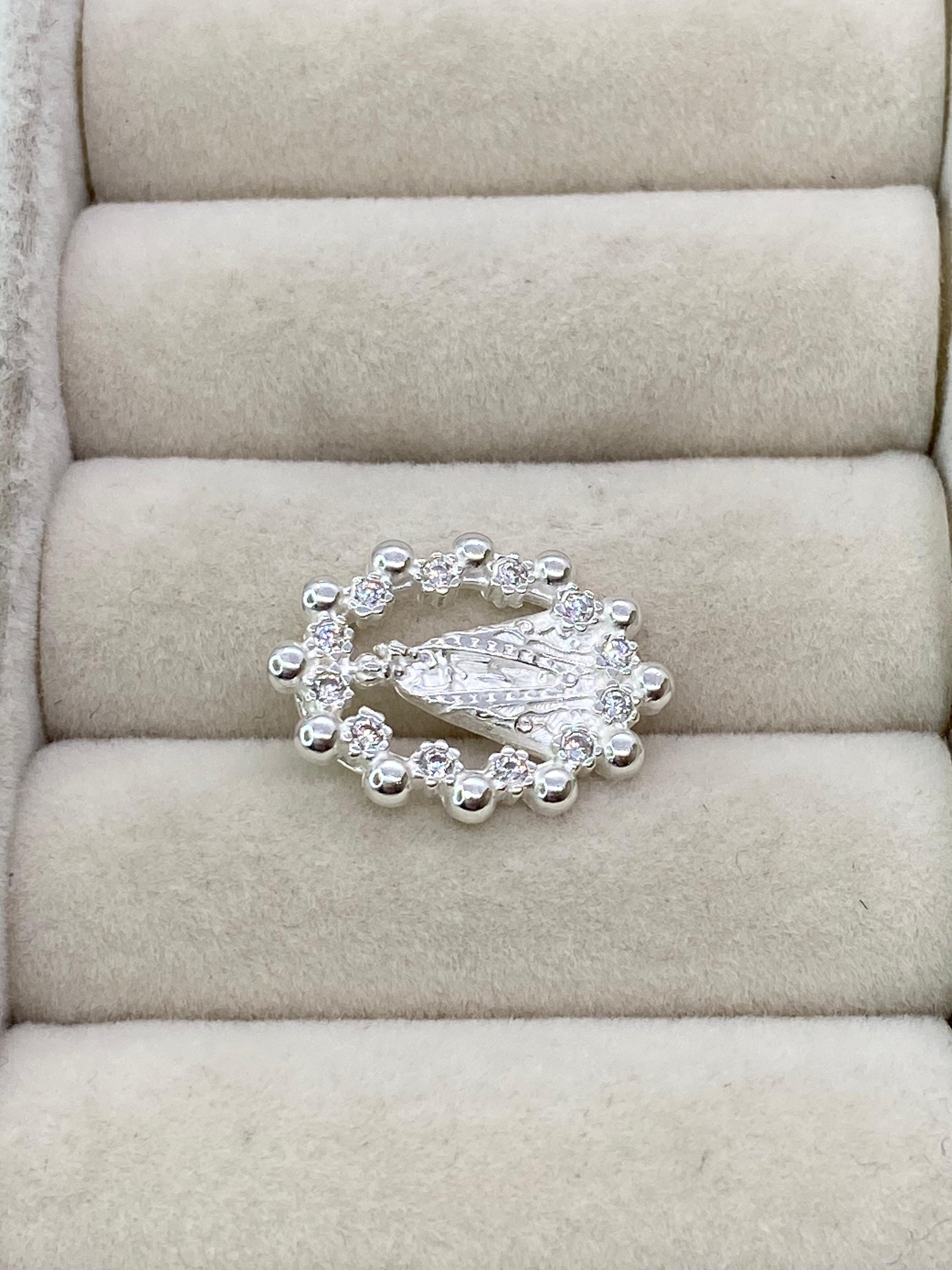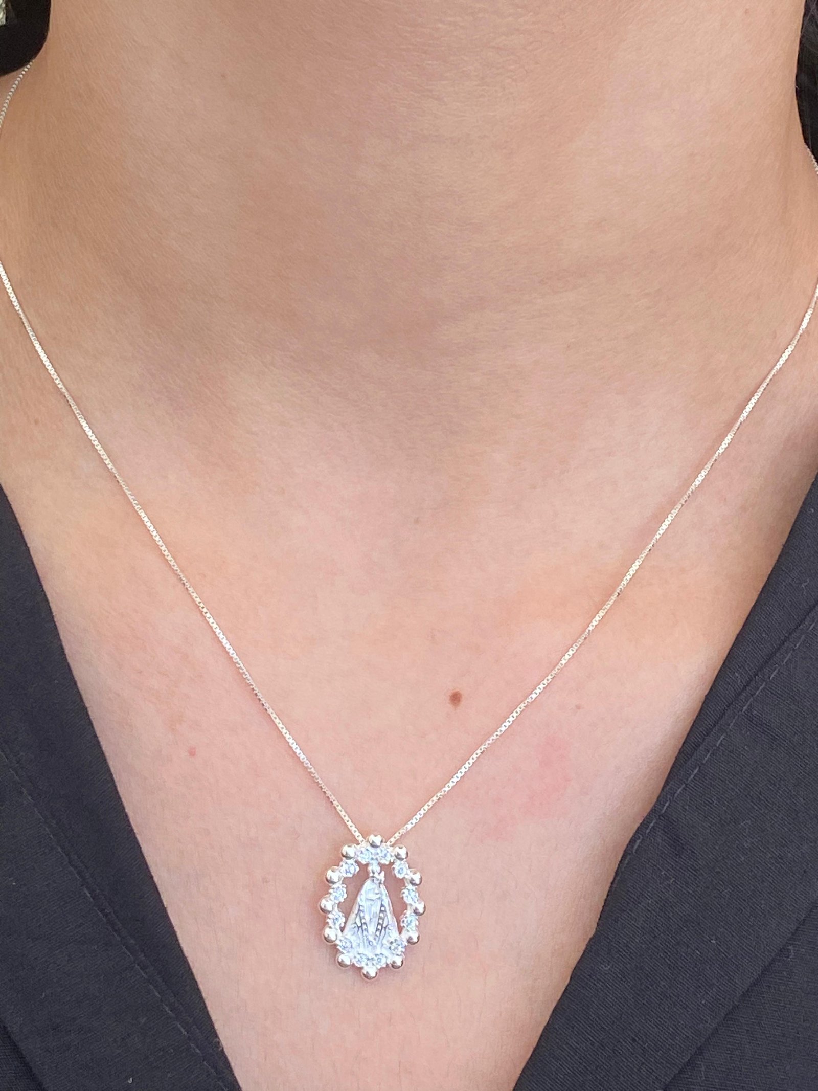 Pingente religioso Nossa Senhora Aparecida, com borda craveja com zircônia brancatrês ,em prata 925 legítima um designer Clássico Atemporal, uma ótima opção para presentear.
