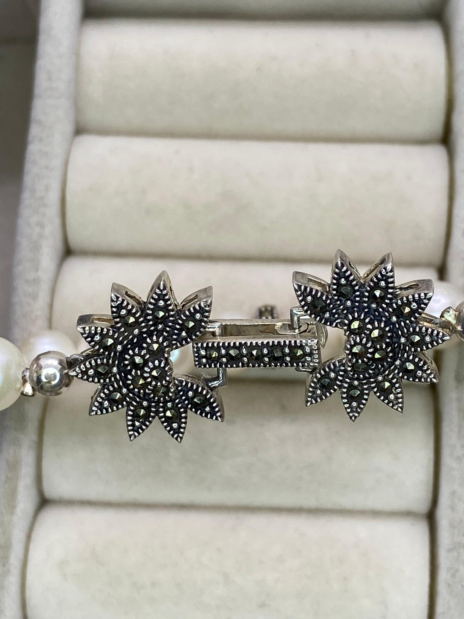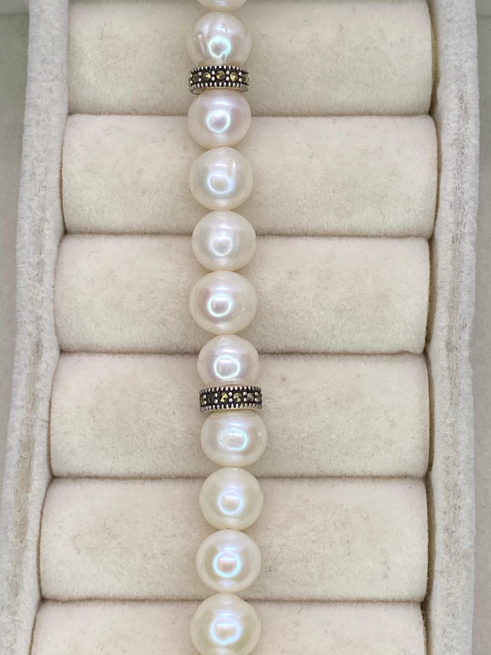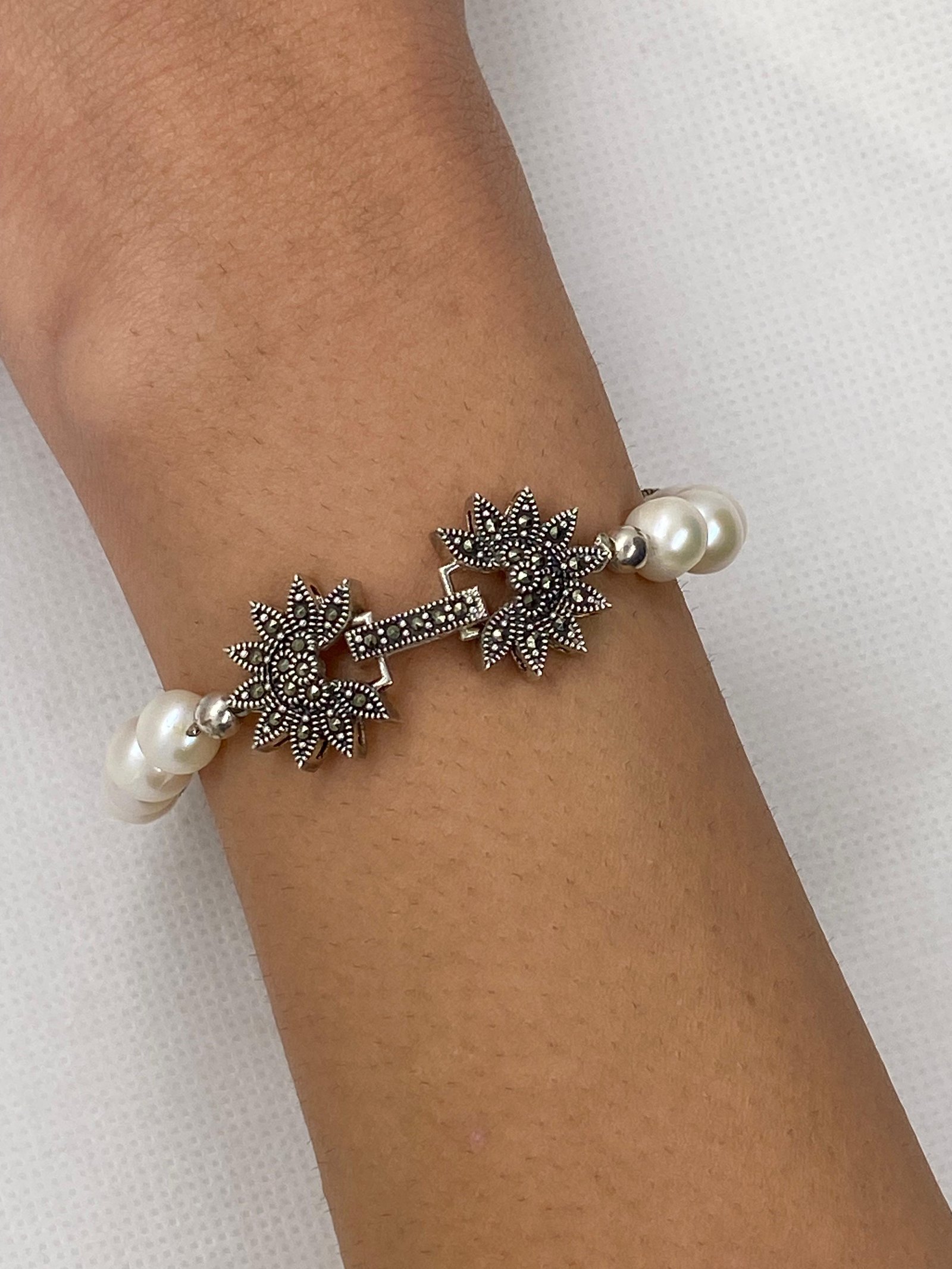 Pulseira chiquissima, com pérolas de água doce com acabamento fecho joia cravejada de marcassita e prata 925, um designer Clássico Atemporal, uma ótima opção para complementar looks casuais quanto mais formais.